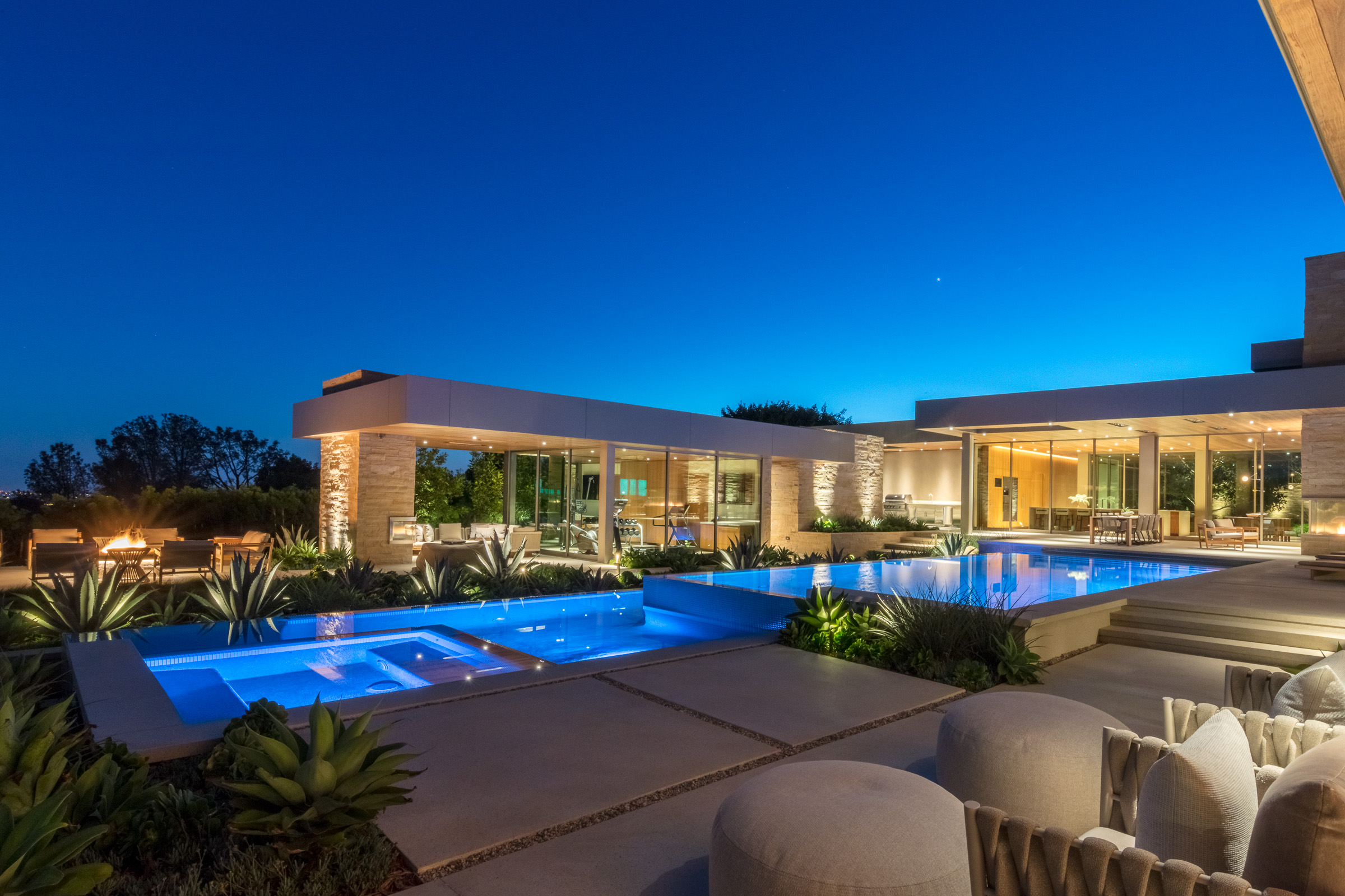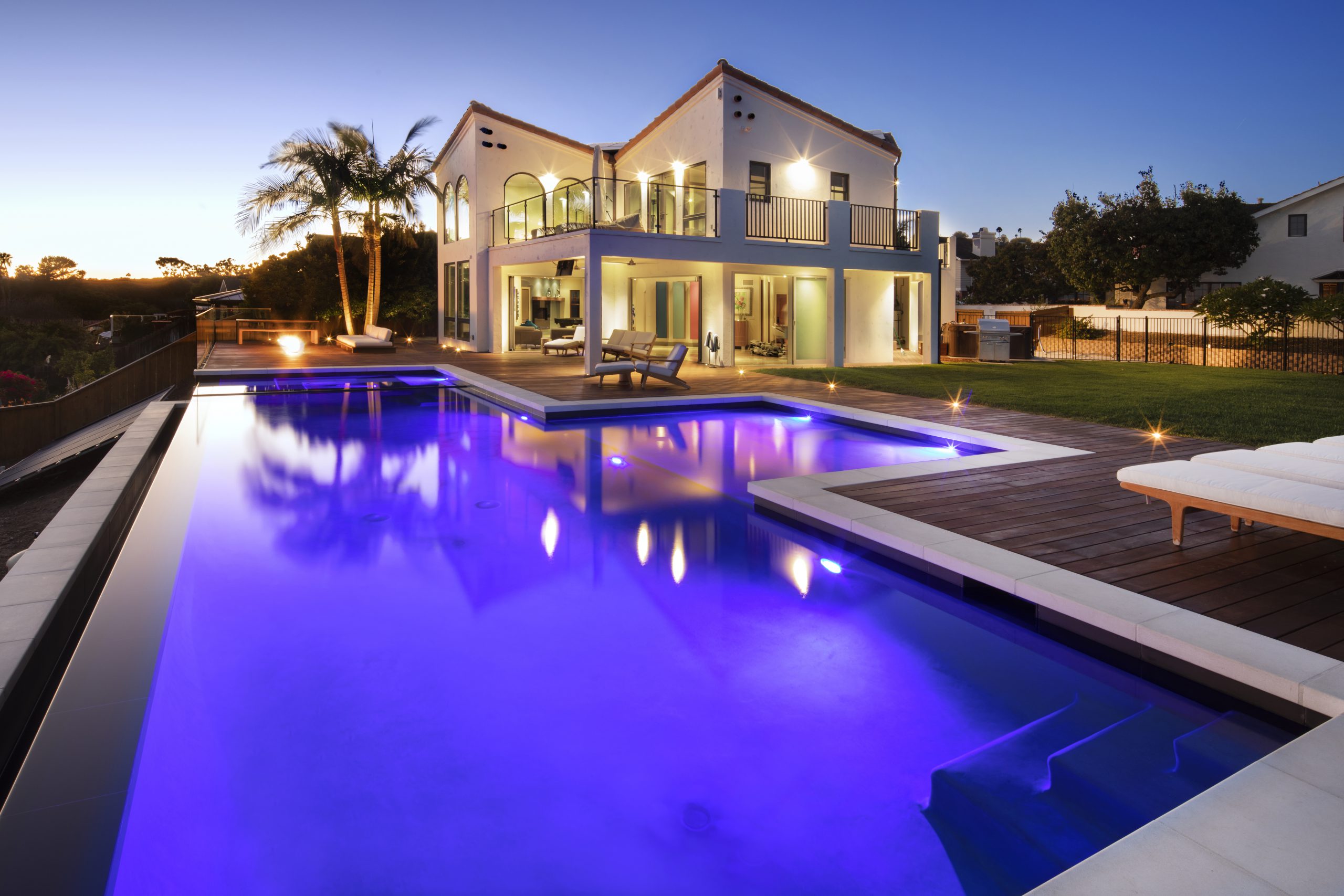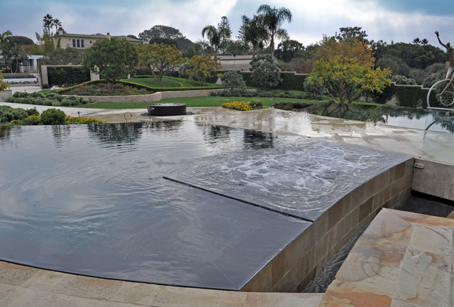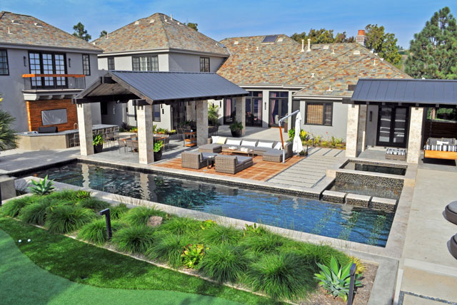 This phenomenal residential San Diego swimming pool goes above and beyond with exemplary design. Two pools, side-by-side, linked by a walkway to the entrance